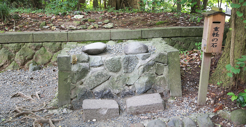 拝殿でお参りを済ませたら、ぜひ立ち寄っていただきたいのが「火の玉石(ひのたまいし)」です。「重軽の石(おもかるいし)」とも呼ばれ、手水舎の近くの石柵の中に2つの黒くて丸い石が置かれています。