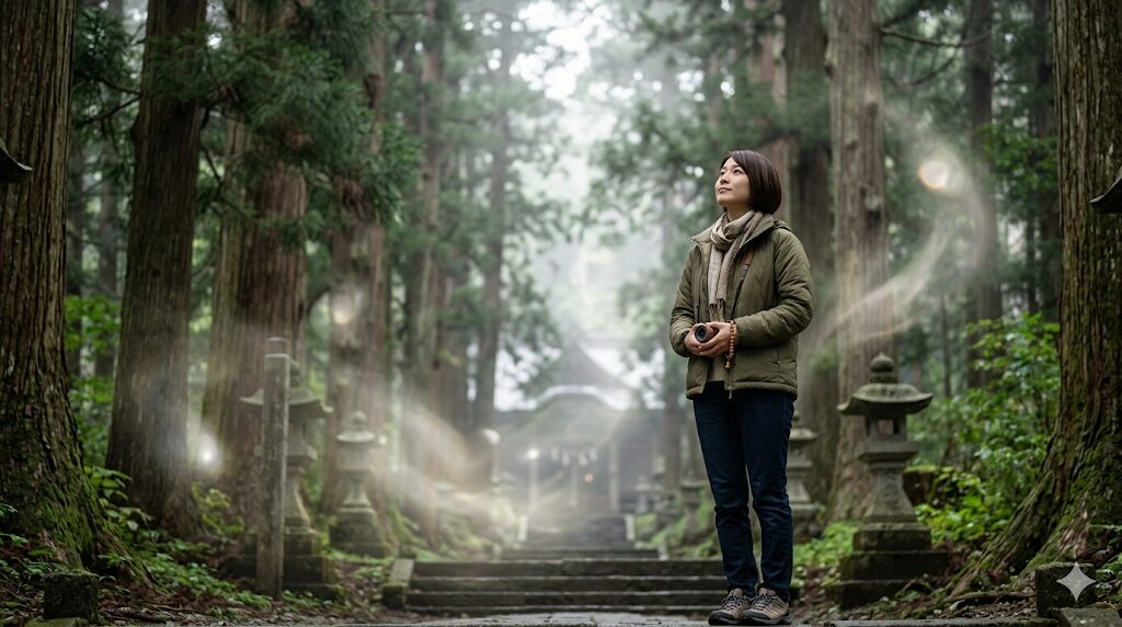 不思議体験が多い理由のひとつには、この圧倒的な自然環境が大きく関係していると思います。樹齢400年超の杉に囲まれたあの道は、日常の感覚をいったんリセットして、五感を研ぎ澄ませるには十分すぎる空間です。普段は気にも留めない風のそよぎや、鳥の声、木漏れ日の角度に、ふと意識が向く。そういう状態になるから、「あれ、なんかいつもと違う感じがする」という体験が生まれやすいのかもしれません。