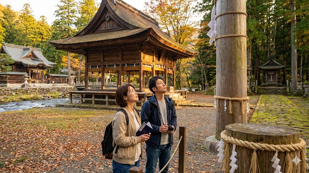 大社づくりの拝殿は国の重要文化財にも指定されており、その精緻な彫刻装飾は見ごたえ十分。境内全体が活気に満ちており、参拝後に下諏訪の温泉街を散策するプランとの相性も抜群です。下諏訪温泉には日帰り入浴できる施設もあり、参拝後のご褒美に立ち寄るのもおすすめですよ。
