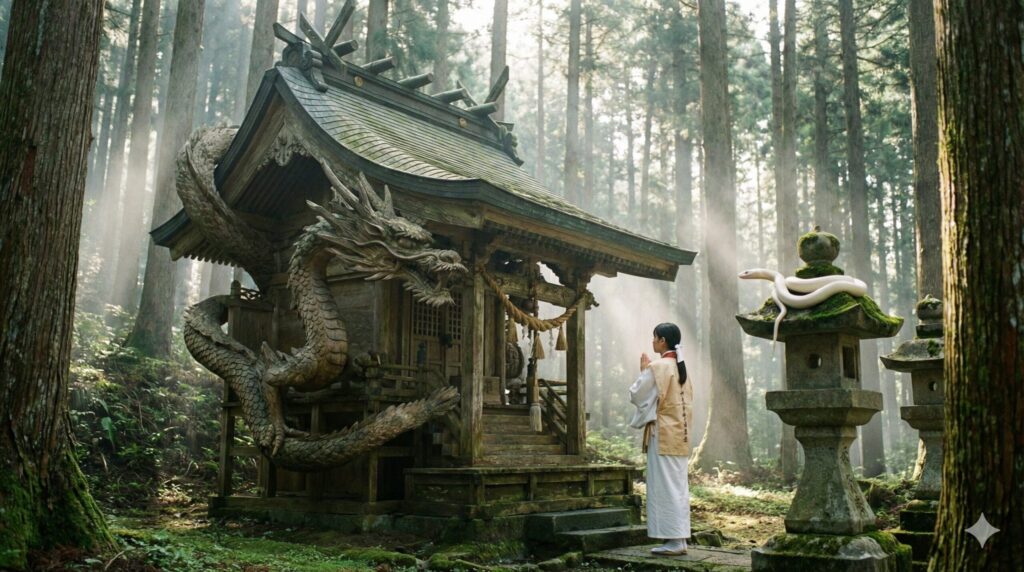 そして、もう一つ欠かせないのが「白蛇伝説」です。高龍神社の奥之院と中社の中間地点には、実際に白蛇が住んでいるという言い伝えがあります。古くから、蛇は脱皮を繰り返すその姿から「死と再生」「永遠の命」の象徴とされてきました。